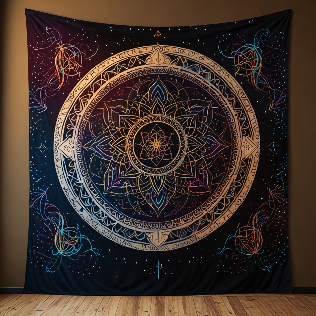 A high-quality, intricately designed sacred geometry tapestry for meditation spaces and energy work. The sacred geometric patterns in this tapestry can aid in meditation, focusing energy, and promoting inner balance.
